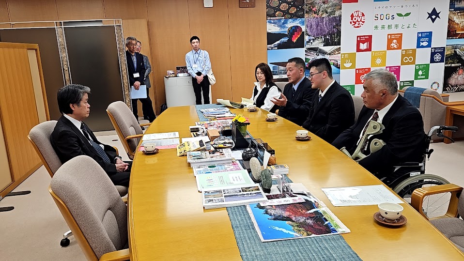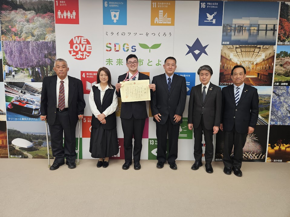 豊田市柔道会所属の榊原大冴さんが、第5回全日本ID柔道大会で優勝され、報告に太田豊田市長を訪れました。仕事をしながら、週2回夜の稽古に頑張ってみえます。(訪問者=本人、ご両親、岩月柔道会会長、私は柔道会顧問)