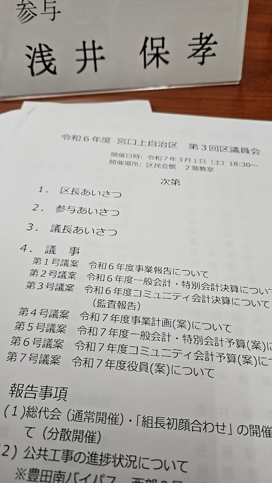 宮口上自治区区議員会 March 27, 2025 3月1日㈯ 「宮口上自治区区議員会」に参与として出席させていただきました。 4月の総会に向けての今年度最後の区議員会です。宮口上自治区は約1,800世帯の自治区です。