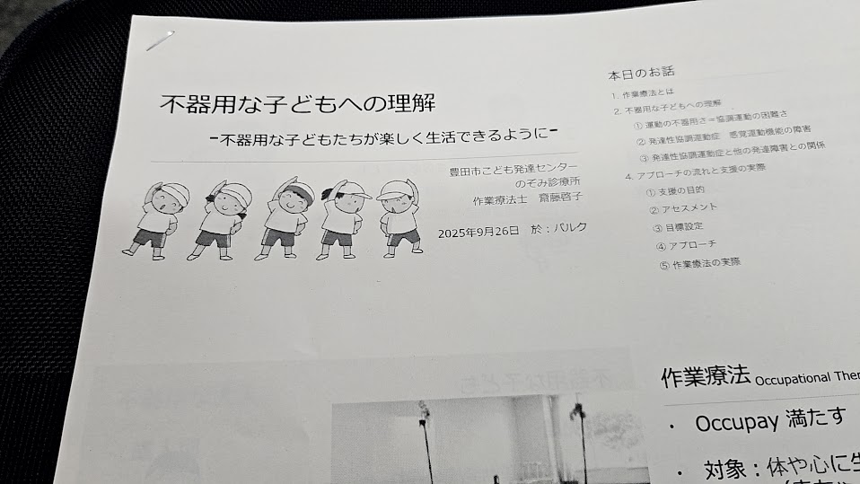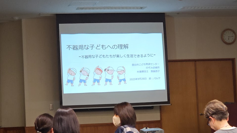 パルクとよた・公開セミナー October 17, 2025 9月27日(土) 今月のパルクとよた・公開セミナーのテーマは「特別支援教育について 」です。発達性協調運動症について学びました。公開セミナーは、毎月開催されており、不登校やいじめ、発達障害などをテーマに、様々な分野の講師のお話が聞くことができ、私以前から毎月参加しています。